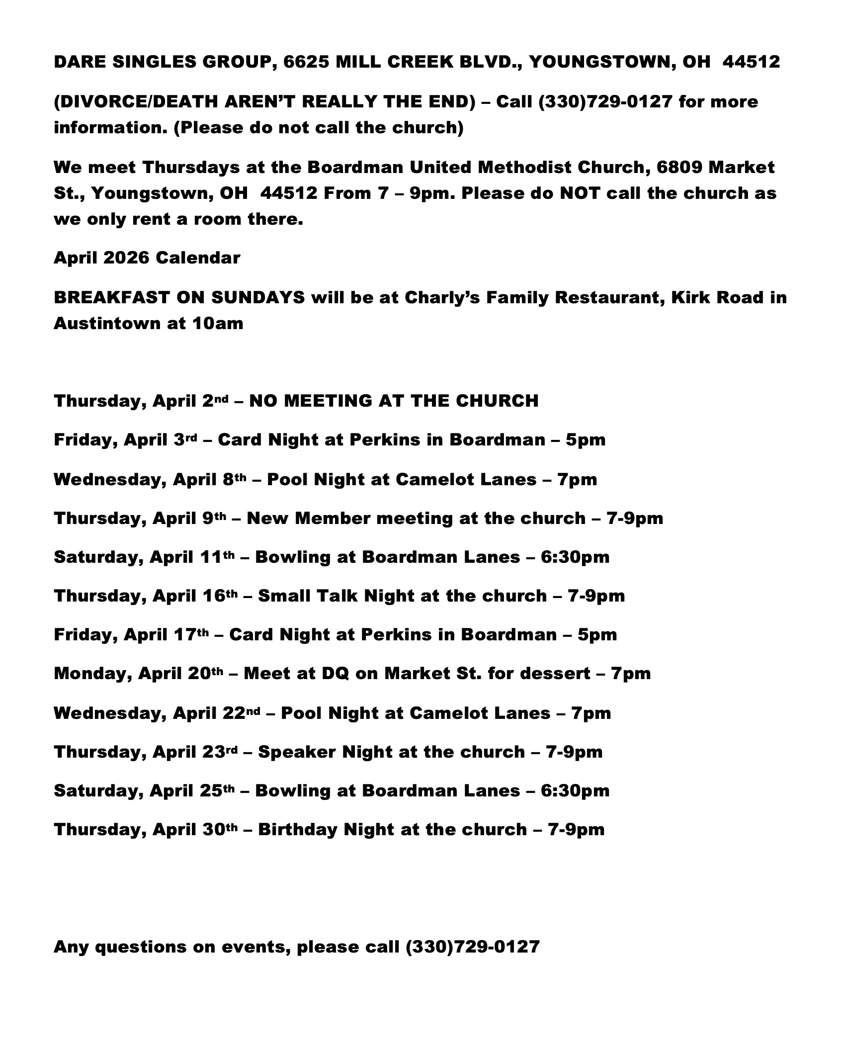 Event Calendar LIFE IS TOO SHORT, join the largest singles group in the Mahoning, Trumbull and Columbiana area. April 2026 Events